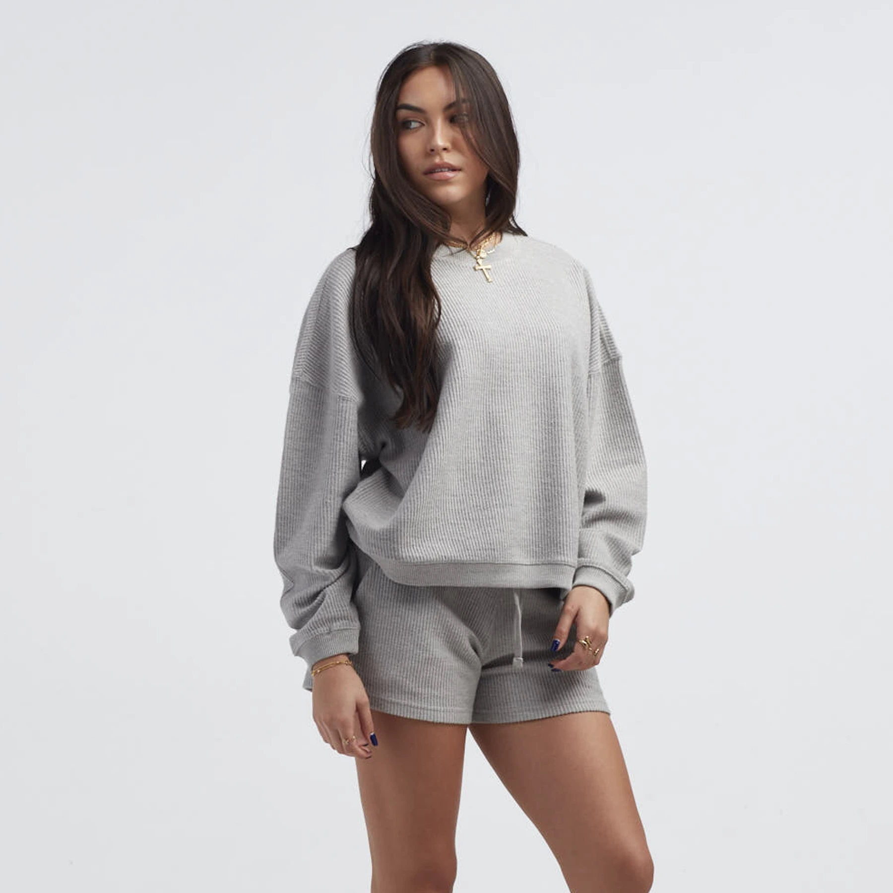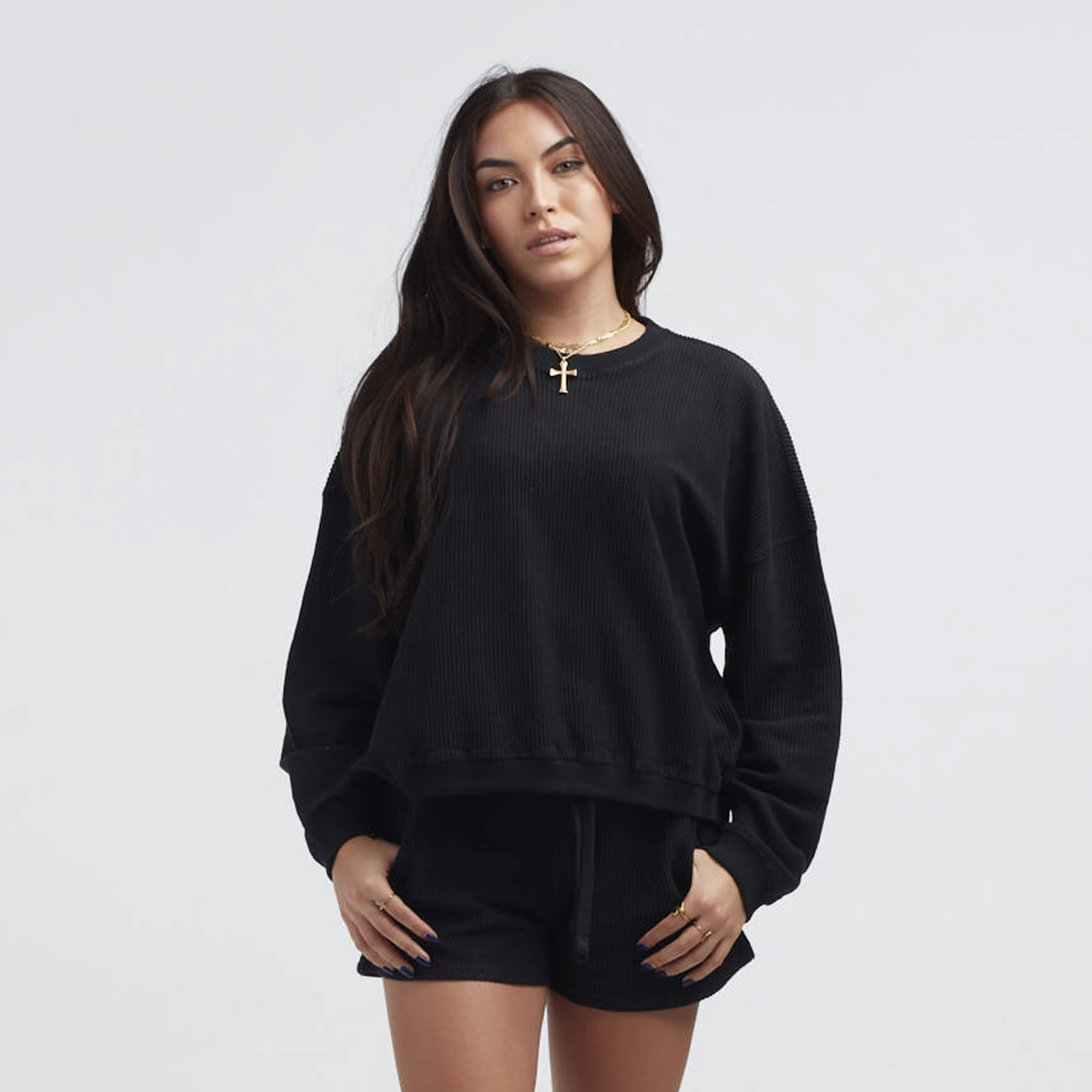 • Details: Facinating Corduroy Textured Fabric. 2×2 Rib Trim. Solid Colors. Side-Seamed. Double-Needle Top Stitch. Under 6% Shrinkage.